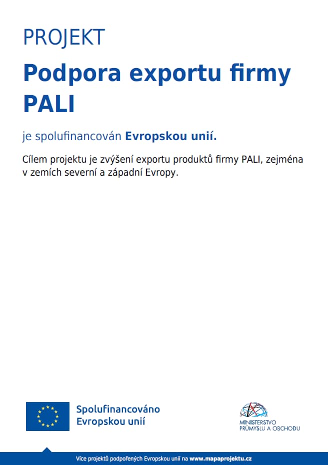 Naše účast na tomto veletrhu je finančně podpořena Evropskou unií v rámci projektu Podpora exportu firmy PALI. Cílem projektu je zvýšení exportu produktů firmy PALI, zejména v zemích severní a západní Evropy.